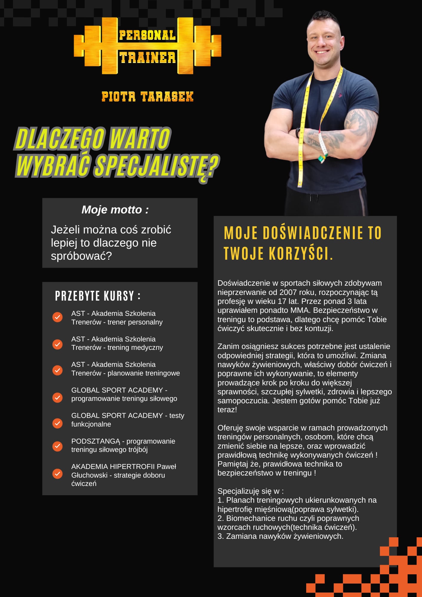 Doświadczenie w sportach siłowych zdobywam nieprzerwanie od 2007 roku, rozpoczynając pracę w tej branży już w wieku 17 lat. Na przestrzeni lat rozwijałem swoje kompetencje nie tylko w treningu siłowym, ale również w sportach walki — przez ponad 3 lata trenowałem MMA oraz JUDO. To doświadczenie dało mi bardzo solidne podstawy w zakresie biomechaniki, kontroli ciała oraz bezpiecznego prowadzenia treningu. Bezpieczeństwo jest fundamentem skutecznego treningu. Dlatego moim celem nie jest chwilowy efekt ani szybka metamorfoza „na zdjęcie”, lecz długofalowy progres bez kontuzji, oparty na prawidłowej technice, świadomym doborze ćwiczeń i realnie dopasowanej strategii działania. Każda trwała zmiana zaczyna się od planu. Zmiana nawyków żywieniowych, odpowiednio zaprogramowany trening oraz poprawne wykonanie ćwiczeń to elementy, które krok po kroku prowadzą do lepszej sprawności, szczupłej sylwetki, zdrowia i wyraźnie lepszego samopoczucia. Prowadzę treningi personalne, ale na tej stronie otrzymujesz znacznie więcej.To miejsce, w którym udostępniam całą swoją wiedzę, zebraną i uporządkowaną w kursach online, planach treningowych oraz prowadzeniu online. Są to rozwiązania, które stosuję na sobie oraz u moich podopiecznych, a nie teoretyczne schematy oderwane od praktyki. Moja praca skierowana jest do osób, które naprawdę chcą zmienić siebie na lepsze — nie tylko wizualnie, ale również funkcjonalnie i zdrowotnie. Specjalizuję się w: hipertrofii mięśniowej, fizjologii organizmu, technikach treningowych, które w realny sposób prowadzą do osiągania celów, planach treningowych ukierunkowanych na kształtowanie sylwetki, opartych na fizjologii, a nie na chwilowych trendach, mitach czy marketingowych obietnicach. Dzięki zaufaniu do procesu wielu moich klientów zmieniło nie tylko swoje ciało, ale w wielu przypadkach również styl życia, pewność siebie i podejście do własnego zdrowia. Jeśli jesteś gotów na realną zmianę — ja jestem gotów pomóc Ci ją osiągnąć. Oto pigułka moich OSIĄGNIĘĆ (przebyte kursy): • AST - Akademia Szkolenia Trenerów - trener personalny, • AST - Akademia Szkolenia Trenerów - trening medyczny, • AST - Akademia Szkolenia Trenerów - planowanie treningowe, • GLOBAL SPORT ACADEMY - programowanie treningu siłowego, • GLOBAL SPORT ACADEMY - testy finkcjonalne, • PODSZTANGĄ - programowanie treningu siłowego trójbój, • AKADEMIA HIPERTROFII Paweł Głuchowski - szkoła programowania treningowego, • AKADEMIA HIPERTROFII Paweł Głuchowski - strategie doboru ćwiczeń, • AKADEMIA HIPERTROFII Paweł Głuchowski - biomechaniczne spojrzenie na dobór ćwiczeń, • AKADEMIA HIPERTROFII Paweł Głuchowski - planowanie jednostki treningowej i tygodnia treningowego, • AKADEMIA HIPERTROFII Paweł Głuchowski - progresja i autoregulacje w trakcie, • AKADEMIA HIPERTROFII Paweł Głuchowski - zrozum hipertrofię, • AKADEMIA HIPERTROFII Paweł Głuchowski - parametry treningowe i manewrowanie nimi, • AKADEMIO - kurs masażu, • AKADEMIA TERAPII - terapia bólu poprzes skórę, • AKADEMIA TERAPII - wstęp do pracy z powięzią, • AKADEMIA TERAPII - manualne uwalnianie powięziowe, • AKADEMIA TERAPII - stretching powięziowy.